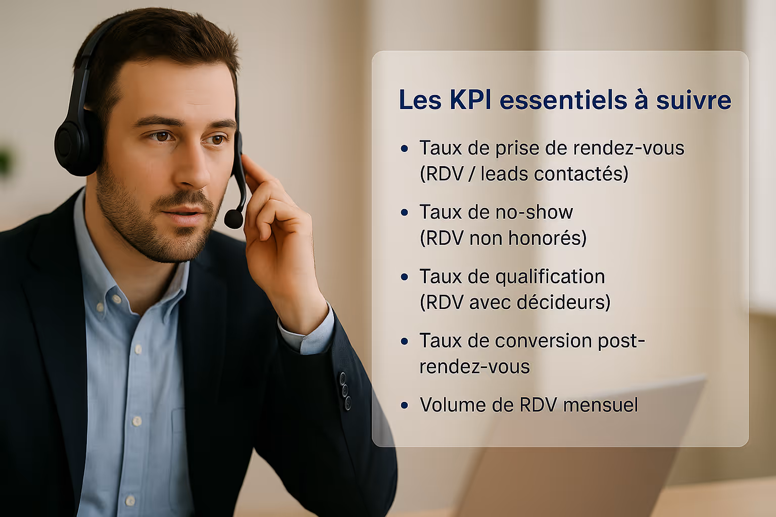 Suivi du nombre de leads contactés, taux de conversion, taux de no-show… tout doit être mesurable.